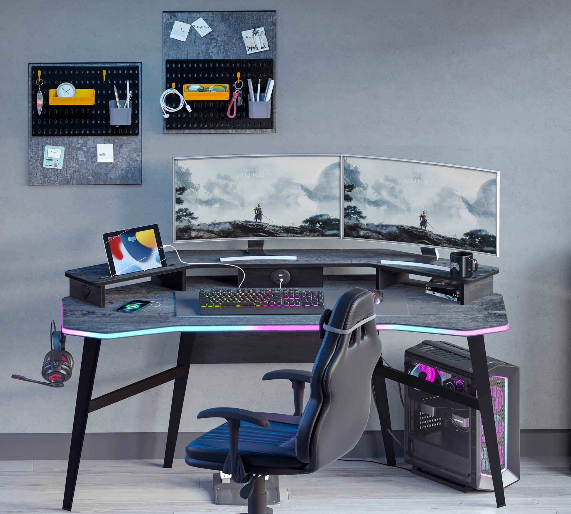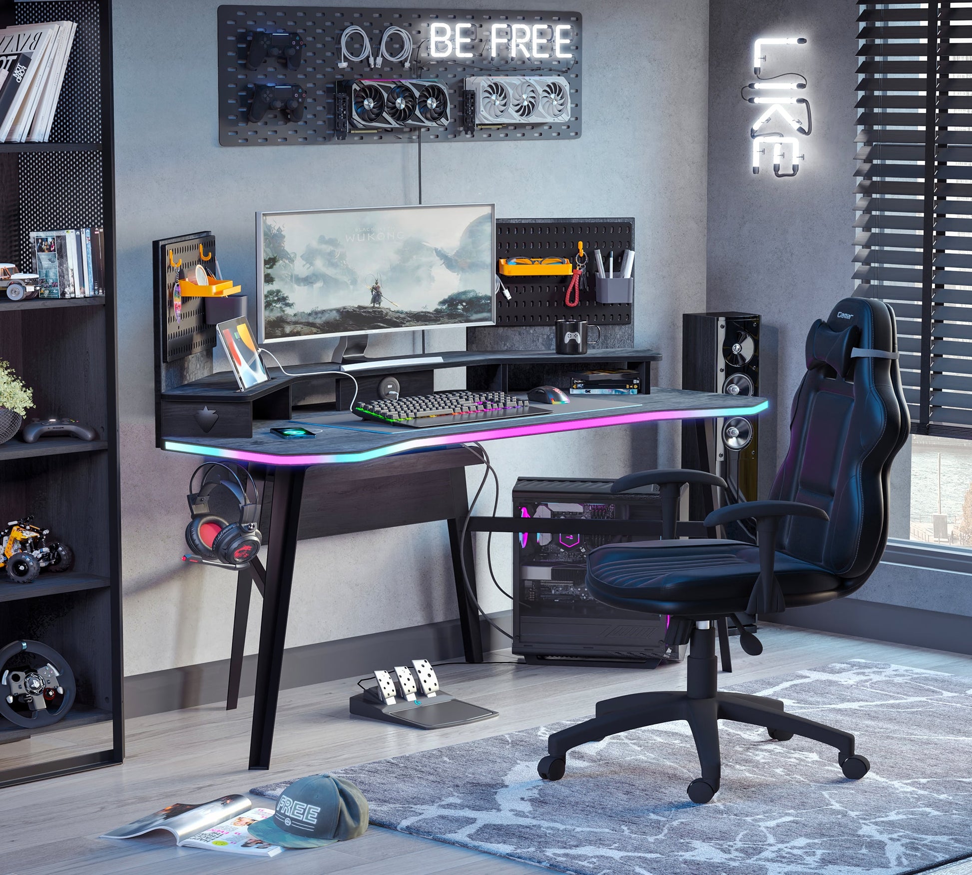 RGB LED осветлението с дистанционно управление, разположено в предната част на работния плот, придава енергия и стил на игралната зона; специалната част под масата предлага идеално решение за разполагане на компютърната кутия.