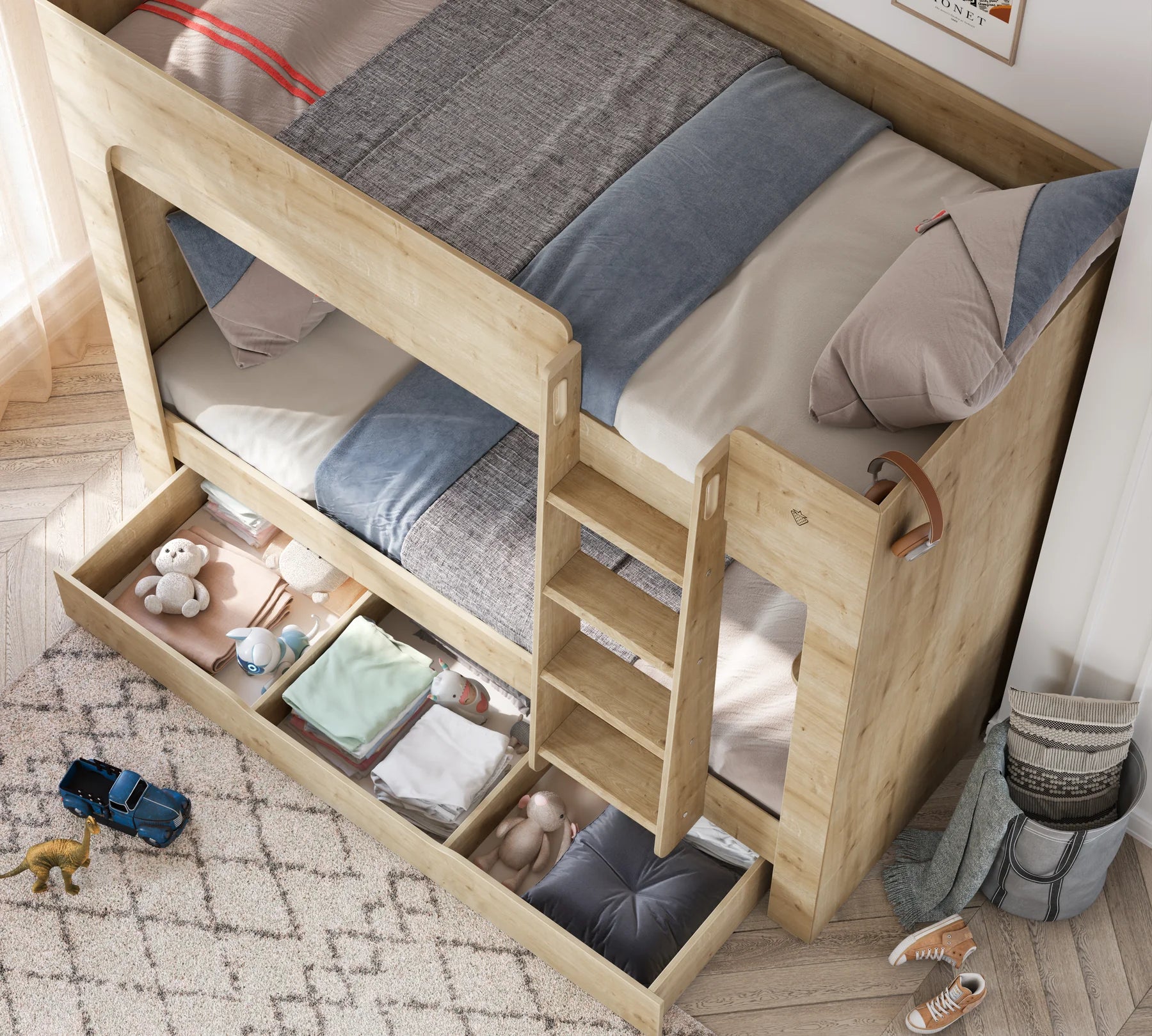 Компактната му височина позволява да се побере идеално под двуетажното легло, създавайки допълнително пространство в стаята ви. То допълва естетически двуетажното легло и добавя практичност към стаята ви.