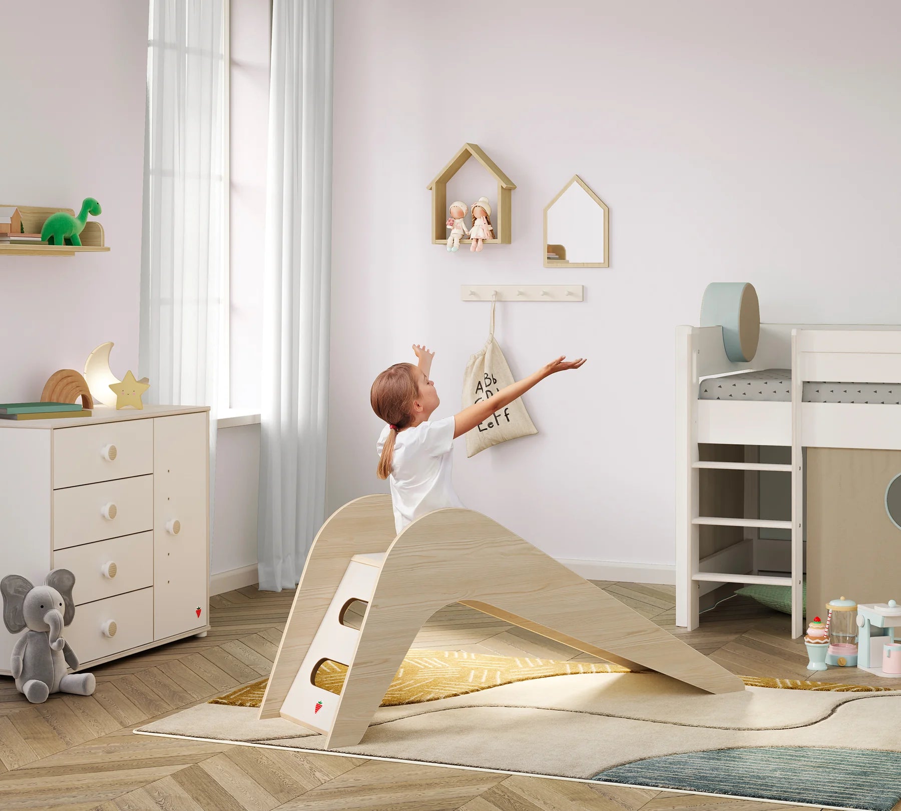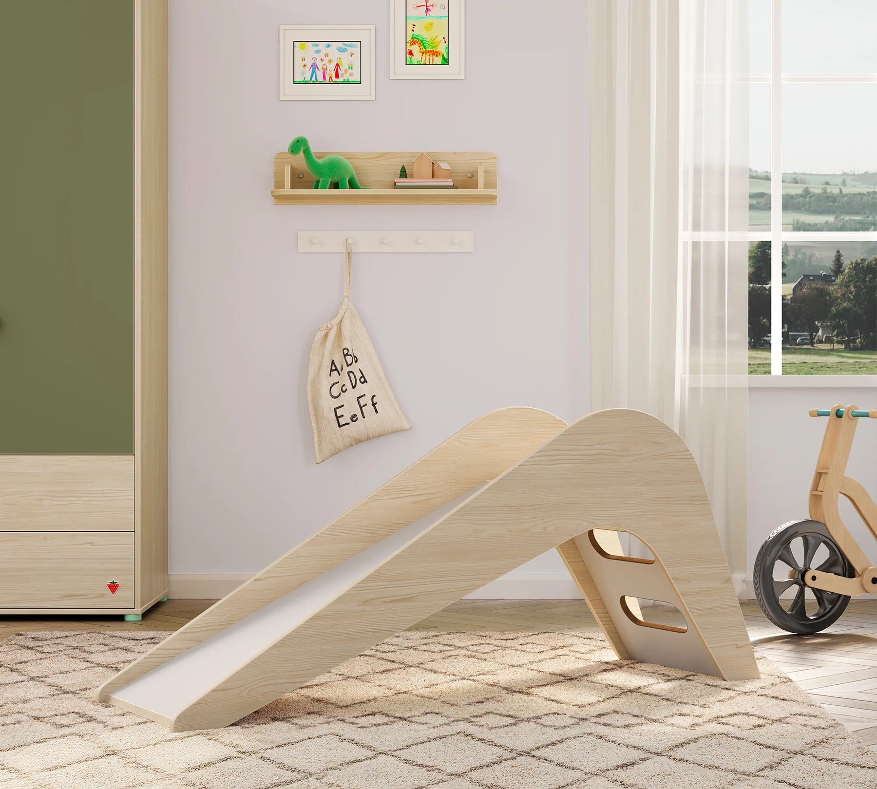 Детската пързалка Montes Natural, с естествената си дървесна текстура, предлага едновременно забавна игра, но и създава безопасна зона, където малките да се забавляват. Вдъхновена от подхода Монтесори, тази специална пързалка помага на децата да развият двигателни умения, да изградят самочувствие и да се насладят на времето си у дома.