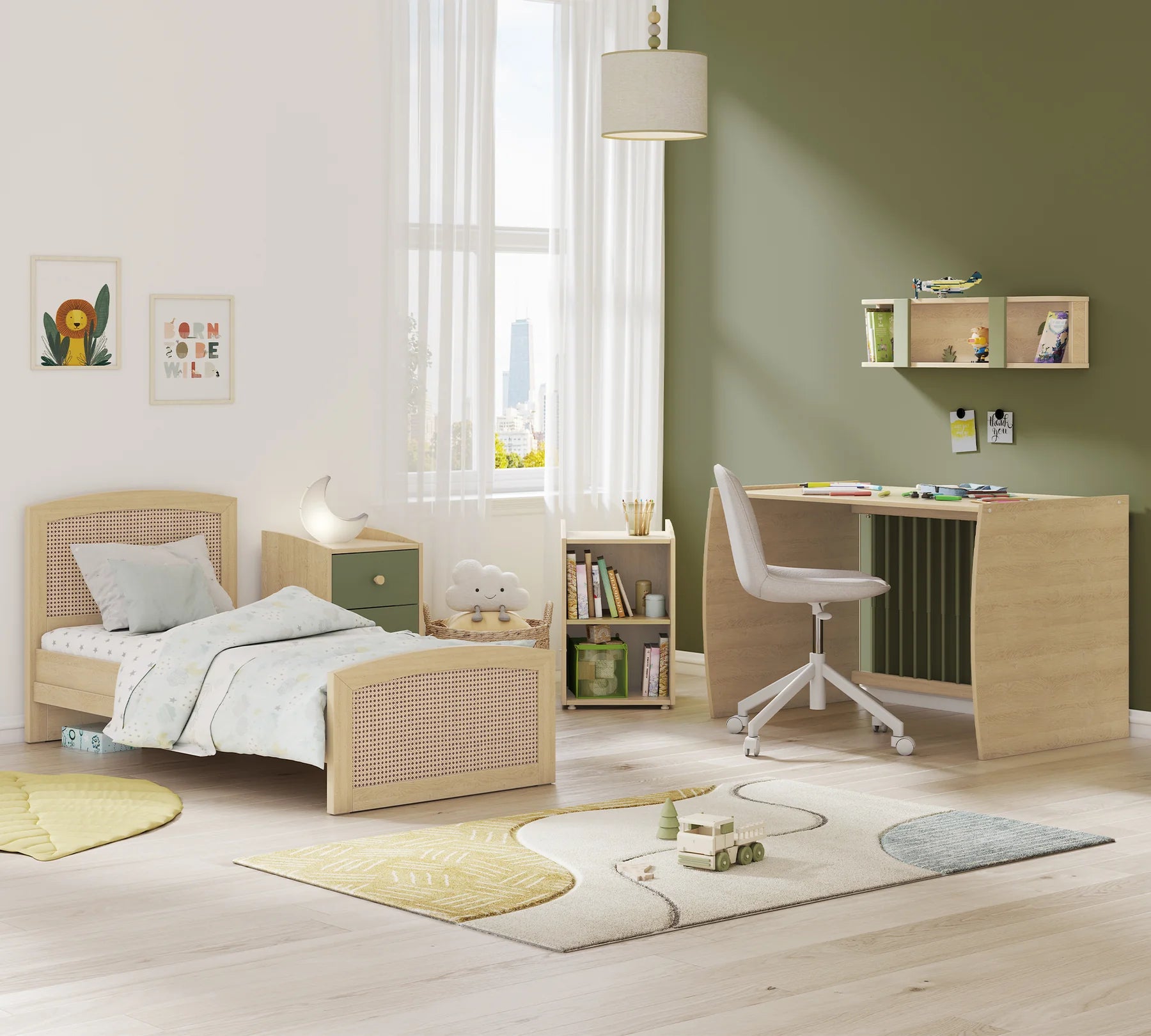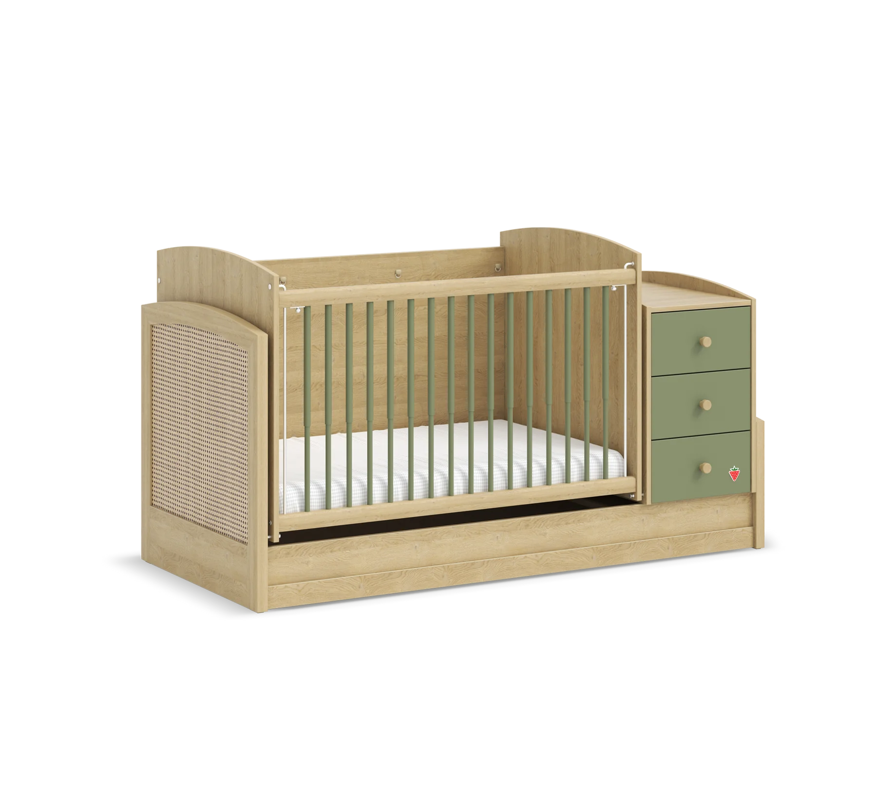 Люлеещият апарат предлага гъвкавост с функцията си за двустранно фиксиране. При трансформиране в легло останалата част може да се използва като бюро, а модулите с чекмеджета и рафтове могат да се използват като нощни шкафчета.