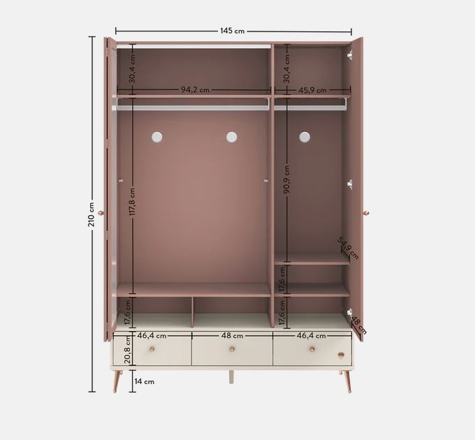 Гардероб Elegance с 3 врати е едновременно модерен и функционален със своя размер с 3 врати, 3 чекмеджета и система за врати акордеон.